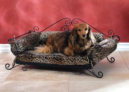 35269 Metal pet bed with leopard print cushion. Some assembly required. May require additional freight charge. 32 3/4" x 17 1/2" x 15" high.